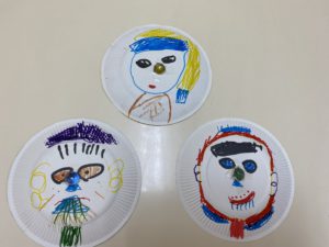 紙皿にそれぞれマジックを使い模様を